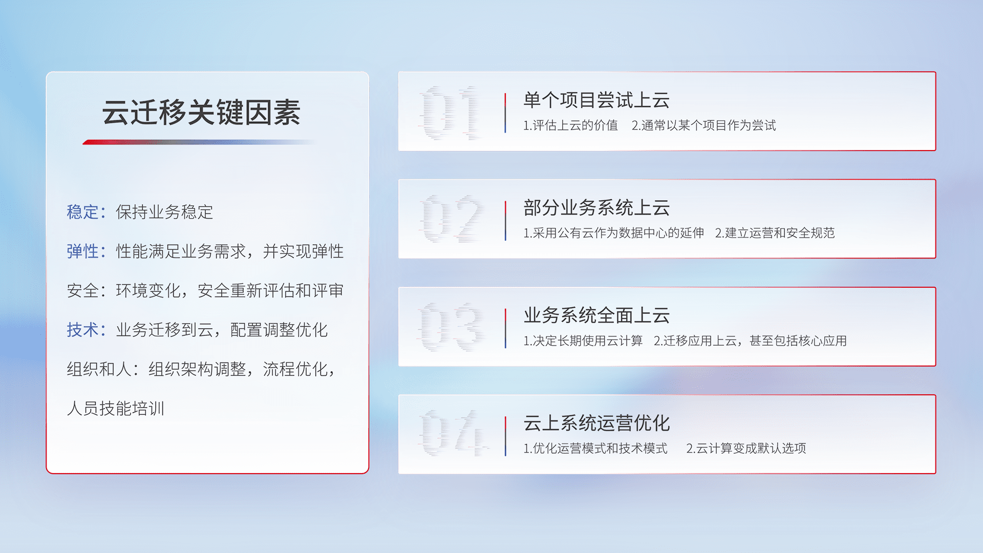 结合实际业务,,从规划设计、、、云平台选型、、、、云原生改造、、、、数据迁移、、、集成交付,,,迁移全过程为客户识别最佳上云路径,,,做好风险识别管理,,,设计网络架构、、、、身份权限、、、、安全审计合规、、、、操作审计、、、、日志审计、、、、监控告警策略、、、、多站点容灾设计等,,,,对云上基础设施进行整体规划,,提升IT治理水平,,,,以满足弹性、、、高可用、、、高性能的需求。。