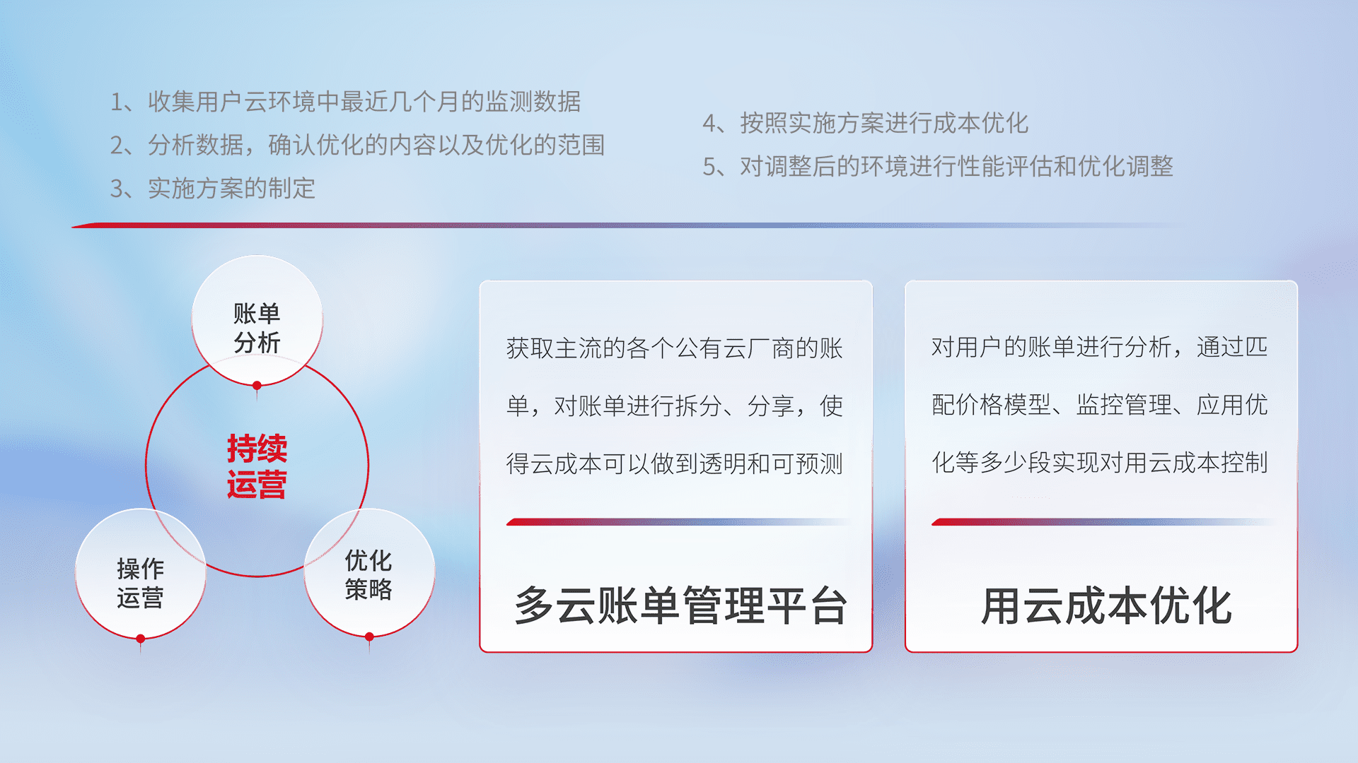 通过多云纳管,,,以统一的资源数据模型把客户的云资源进行抽象和封装,,进而实现对多云资源的统一操作,,,,保障云资源管理的可靠性、、、、稳定性与可用性。。量身定制化运维内容,,配置、、、、开发运维、、、、补丁管理、、、、备份、、监控、、、、认证和访问管理、、、、审计和日常巡检等,,,,保障在用云过程中的可靠度,,,稳定度以及高可用率。。。。